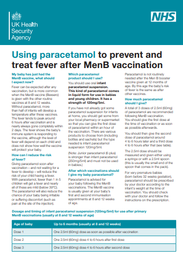 23rd June 2025: Information updated about the meningococcal B (MenB) vaccine and paracetamol use. Updated to reflect the change in timing of MenB doses to 8 and 12 weeks of age in line with the changes to the routine childhood immunisation programme from 1 July 2025