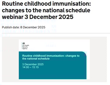 On Wednesday 3 December 2025, 14:00 – 15:15, the UK Health Security Agency (UKHSA) Immunisation Team will be hosting a webinar about the second phase of the planned changes to the routine childhood vaccination schedule which will be implemented from January 2026. This will include the introduction of a varicella (chickenpox) vaccination programme (MMRV) and a new routine vaccination appointment at 18 months of age. Health Professionals only. Sign up here.