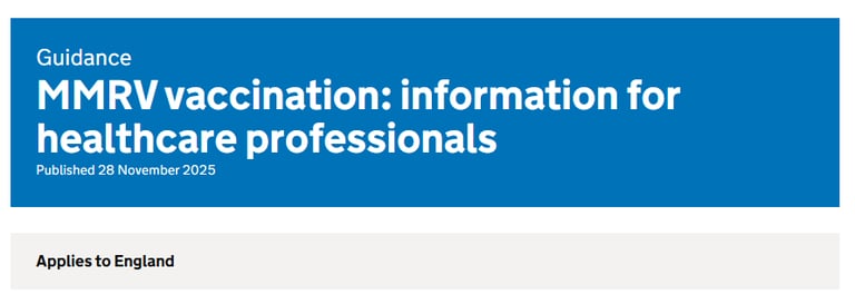 10th Dec: Childhood schedule changes 2025 and 2026: information for healthcare practitioners doc updated to account for MMR. This is a VERY useful doc. Get it bookmarked ASAP!. This doc has also been produced: MMRV and febrile convulsions. Febrile convulsions are a common in children with a high fever, this guidance explains to parents and carers what a febrile convulsion is, and when to seek medical help.