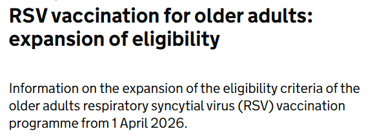 2nd Feb: RSV vaccination for older adults: expansion of eligibility. See here for Information on the expansion of the eligibility criteria of the older adults respiratory syncytial virus (RSV) vaccination programme from 1 April 2026. Don't forget (See news item last month) In February 2026 NHSE is running a national RSV invitation campaign to support uptake. Invitations will be sent to unvaccinated individuals that are eligible for the older adults RSV vaccination programme. The Green Book has also been updated with latest evidence and details of the catch-up programme for people age 80 and over, JCVI advice on clesrovimab, and MHRA guidance on preF vaccines.