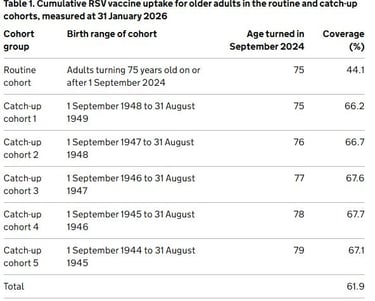 24th April 2025: The RSV programme is doing relatively well for vaccine uptake. As of 31 March 2025, the overall vaccine coverage in the catch-up cohorts (adults aged 75 to 79 before the programme start date) reached 60.3%, up from the 54.8% reported in the February 2024 report.
