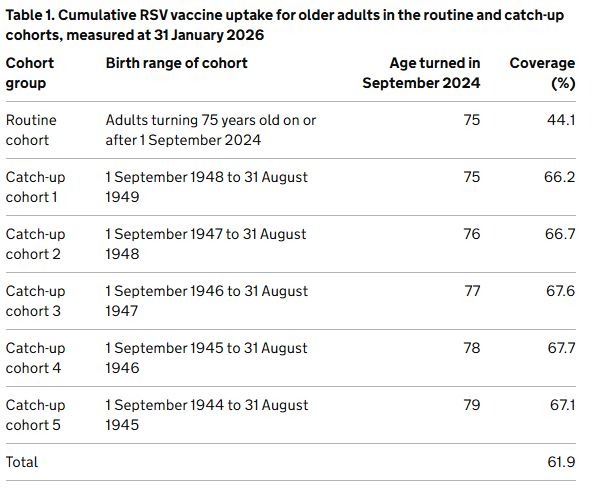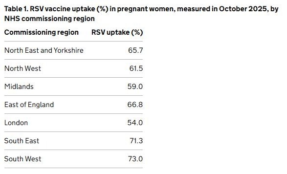 26th Feb 2026: RSV uptake on the maternal programme has been published for this month. Sneak preview: 59.9% (25,398 out of 42,424) of women that reported giving birth during the survey month received an RSV vaccine. Coverage varied by ethnic group, with the highest coverage reported among the Chinese ethnic group (74.3%) and the lowest among the Black - Caribbean ethnic group (34.0%).