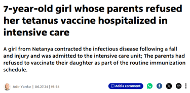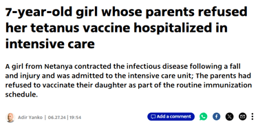 JUNE 2024 a sad reminder of why Tetanus vaccination is super important! 7-year-old girl whose parents refused her tetanus vaccine hospitalised in intensive care