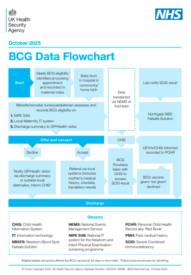 21st October 2025: Data flowchart describing the BCG vaccination and severe combined immunodeficiency (SCID) screening data flow process updated in line with procedural changes around SCID screening.