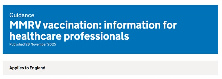 10th Dec: Childhood schedule changes 2025 and 2026: information for healthcare practitioners doc updated to account for MMRV. This is a VERY useful doc. Get it bookmarked ASAP!. This doc has also been produced: MMRV and febrile convulsions. Febrile convulsions are a common in children with a high fever, this guidance explains to parents and carers what a febrile convulsion is, and when to seek medical help.